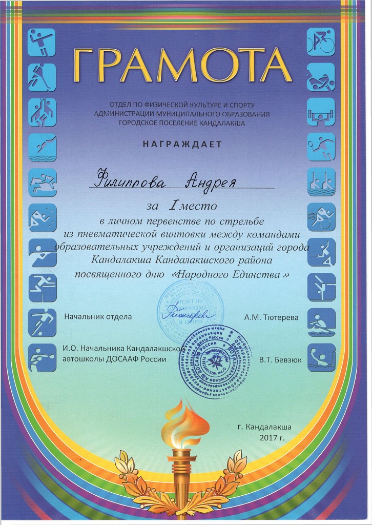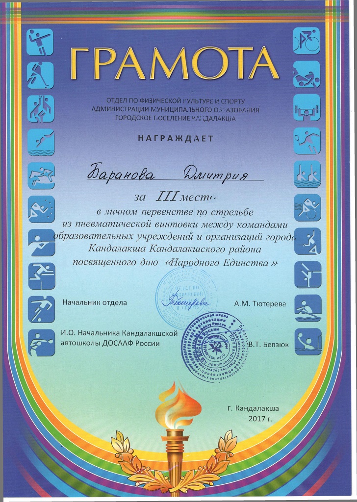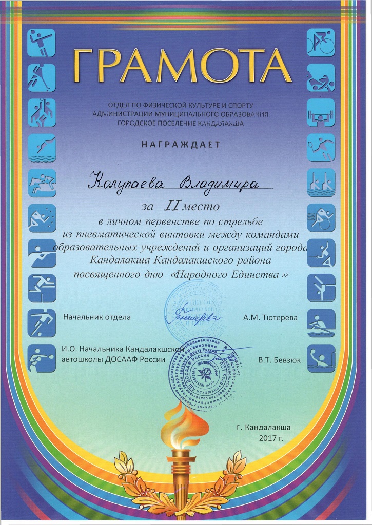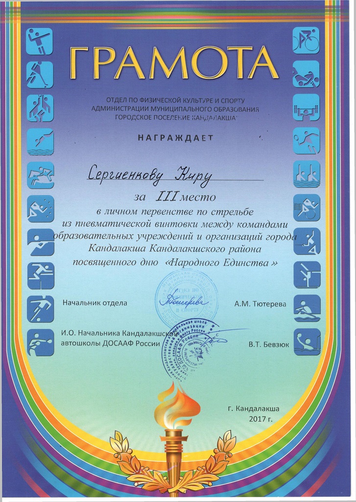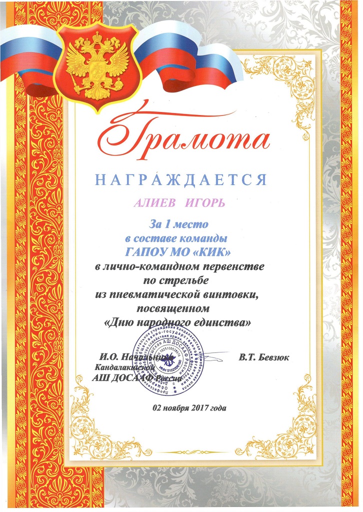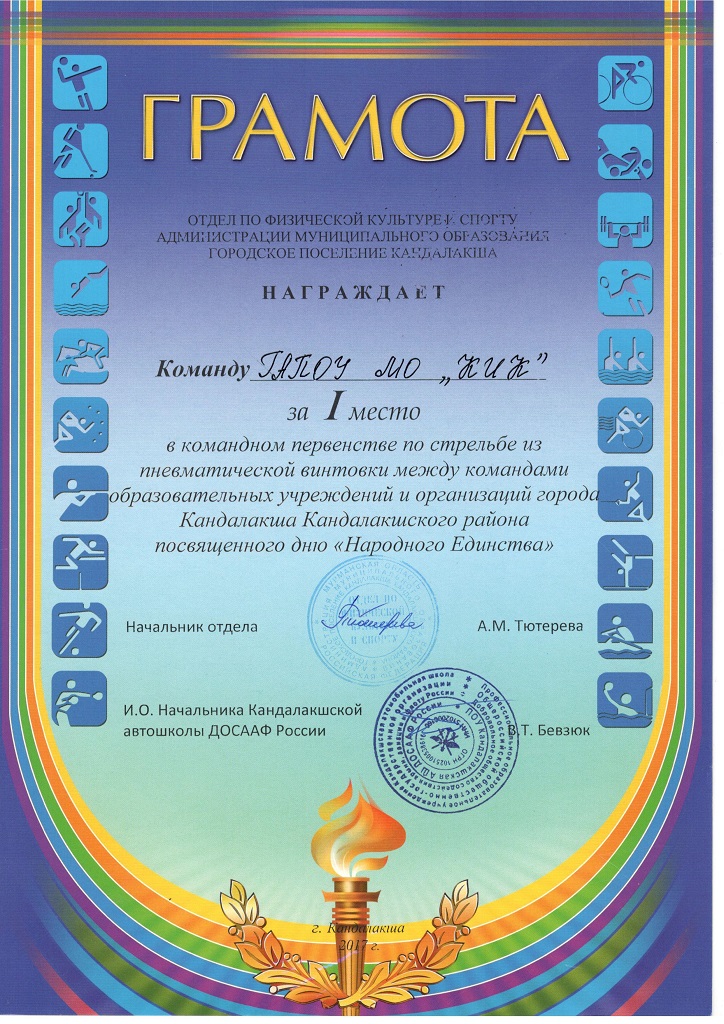 Во исполнение плана совместных мероприятий военного комиссариата по Кандалакшскому, Ковдорскому районах и г. Полярные Зори и ГАПОУ МО «Кандалакшский индустриальный колледж» по военно-патриотическому воспитанию студентов на 2017/2018 учебный год, на базе Кандалакшской автомобильной школы ДОСААФ России 02 ноября 2017 года прошли соревнования по стрельбе из пневматической винтовки между командами образовательных учреждений и организаций города Кандалакша Кандалакшского района, посвященного дню «Народного Единства» Команда ГАПОУ МО «КИК» показала в командном и личном первенствах высокие результаты. В личном первенстве среди юношей, обучающиеся колледжа заняли весь пьедестал почета: В личном первенстве среди девушек III место заняла обучающаяся группы №240 Сергиенкова Кира. Поздравляем всех участников соревнований с заслуженной победой и желаем новых высоких достижений! Молодцы, так держать!!!