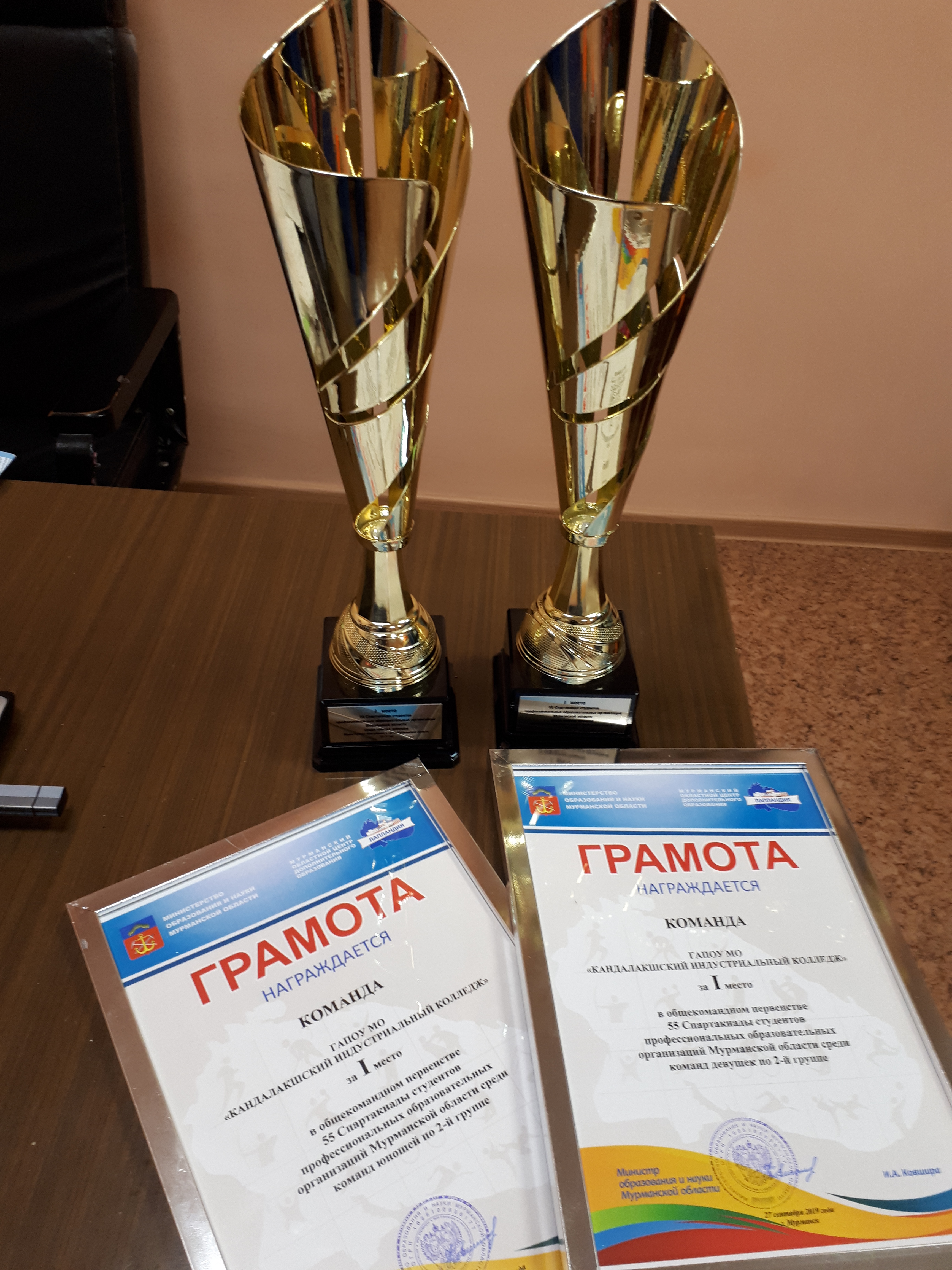 По итогам 55 спартакиады студентов ПОО Мурманской области были вручены дипломы кубки победителям и призерам этих стартов. Впервые нашим обучающимся удалось стать чемпионами сборными командами юношей и девушек. Долгие и упорные тренировки соленый пот, кровавые мозоли. Все это помноженное на морально волевые качества каждого, проявленных в честной борьбе в различных городах нашей области Апатиты, Полярные Зори, Мурманск, Кандалакша. Все спортсмены сборных команд по многоборью ГТО, легкоатлетическому двоеборью, волейболу, баскетболу ,настольному теннису ,лыжным гонкам и Арктическим играм внесли свою лепту защищая честь и достоинство «Кандалакшского индустриального колледжа» и нашего поселения Кандалакша смогли достойно представлять на спортивных площадках и проявлять лучшие качества ,которые дает спорт сила ,быстрота, выносливость и порядочность. Хочется каждого отметить и высказать слова благодарности пожать крепкую ладонь настоящего спортсмена