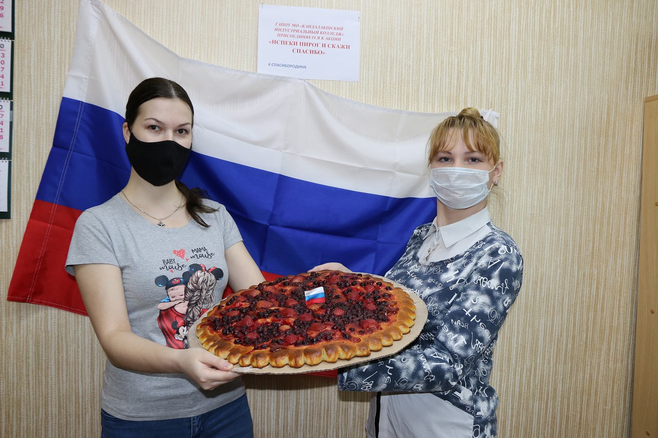 В 2020 году в рамках празднования Дня России проводится ряд мероприятий, направленных на формирование патриотизма, российской гражданской идентичности, уважения к традициям и новациям российской государственности. Одним из проектов является Всероссийская Акция «Испеки пирог и скажи спасибо!», которую сразу подхватили студенты вместе с мастерами производственного обучения. Ребята испекли пироги, согласно условиям акции, разместив маленький флажок триколор в центре пирога.