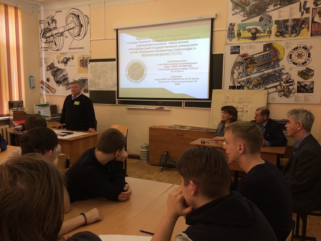 20 апреля 2017 года, в колледже прошла встреча с представителями Мурманского филиала ПГУПС. На встрече присутствовали группы 261/1, 261/2, 361/, 361/2 обучающиеся по профессии «Машинист локомотива». вместе с мастерами и преподавателями. Представили ПГУПС рассказали о специальностях, по которым идёт набор на обучение в университет, а также о правилах приёма и условиях обучения. Затем состоялся брейн-ринг по тематике железнодорожного транспорта. В состязании участвовало 5 команд. Ребята с интересом и воодушевлением отвечали на вопросы по истории железнодорожного транспорта и технические вопросы железнодорожных специальностей.