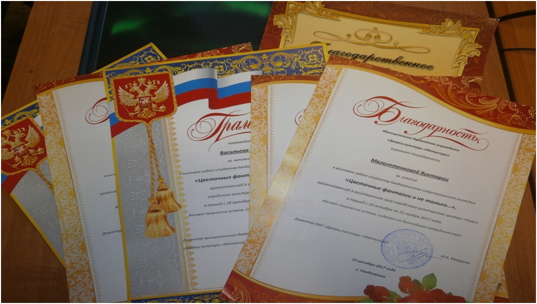19.10.17 в 16.00 в выставочном зале ГКЦ «Нива» состоялось открытие выставки работ обучающихся молодёжного объединения «Творческая мастерская». Творческие работы «Цветочные фантазии и не только…» представили 15 обучающихся по живописи и тестопластике, под руководством педагога дополнительного образования колледжа Зелинской Адели Ивановны. Все ребята награждены благодарностями Дворца культуры «Металлург».